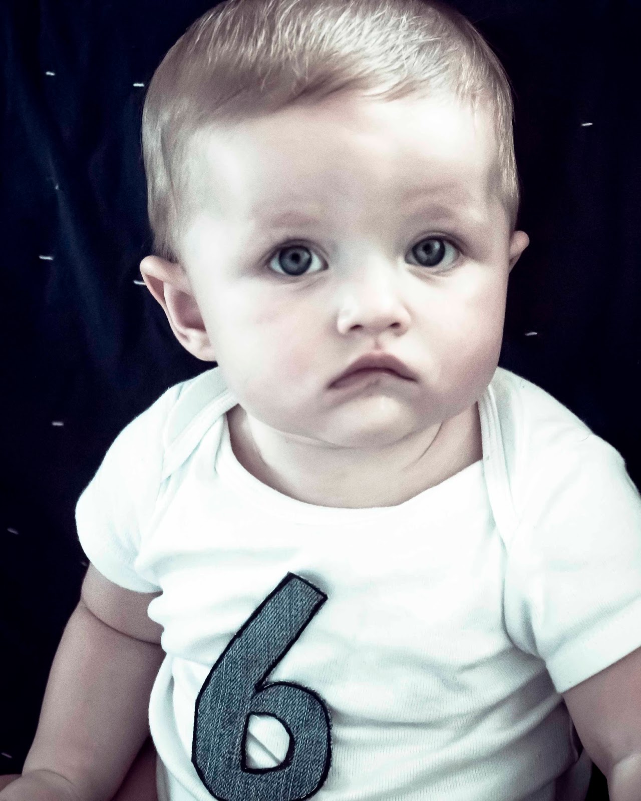 -Oliver has begun sitting up pretty much by himself. Sometimes when he has had enough he will thrust his head backward full force to lay down, so I still have to help him sit, or prop pillows around so he doesn't hurt himself. He also has fallen face forward flat into the ground. So he is still learning how to steady himself.